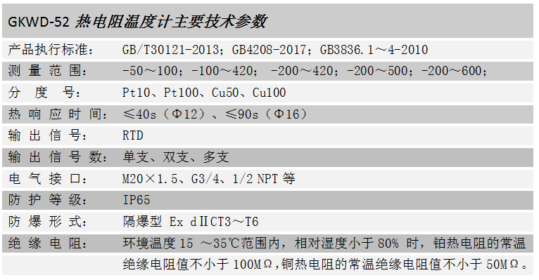 GKWD-52熱電阻溫度計是利用電阻與溫度呈一定函數(shù)關(guān)系的金屬導(dǎo)體或半導(dǎo)體材料制成的接觸式溫度儀表,可直接測量多種生產(chǎn)過程中從-200~600℃范圍內(nèi)的液體介質(zhì)、氣體介質(zhì)、蒸汽以及固體表面等的溫度,現(xiàn)已成為溫度遠(yuǎn)傳儀表的理想選擇。